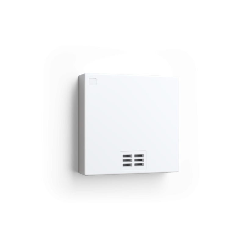 Capteur multifonctionnel avec pile CR2450 remplaçable (45 x 45 x 13 mm) avec capteurs pour la température, l'humidité et la luminosité.